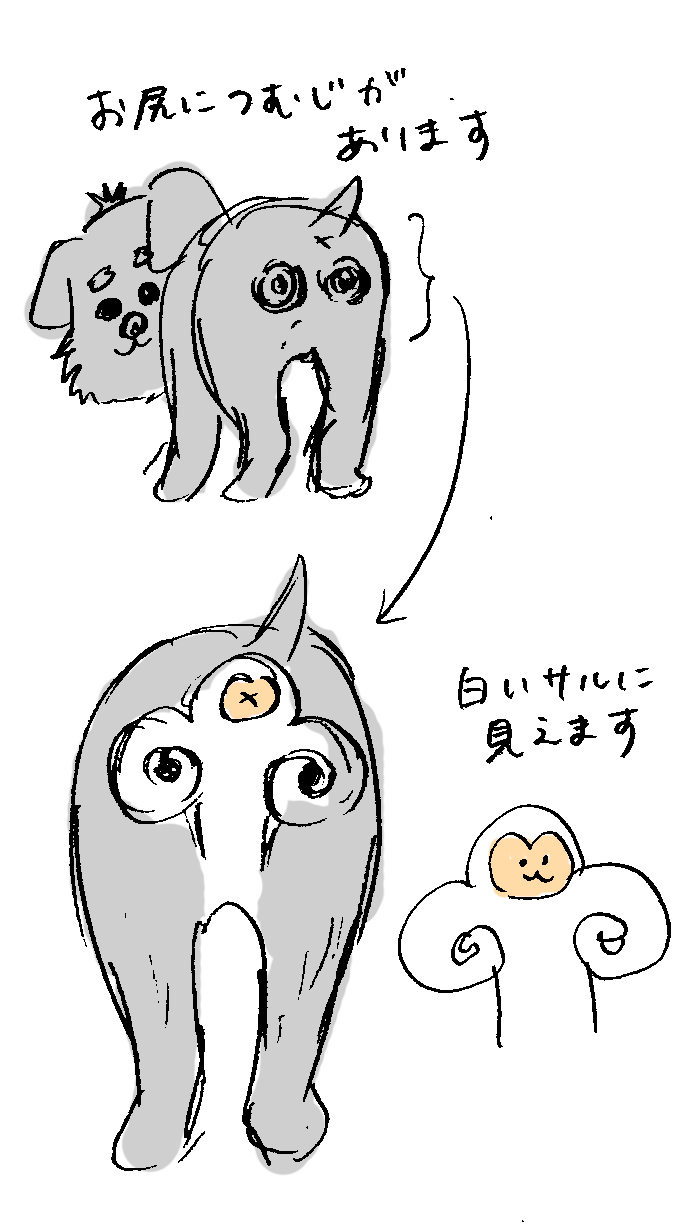 お尻につむじがふたつあり、そのあたりの毛が白くて猿に見えます。